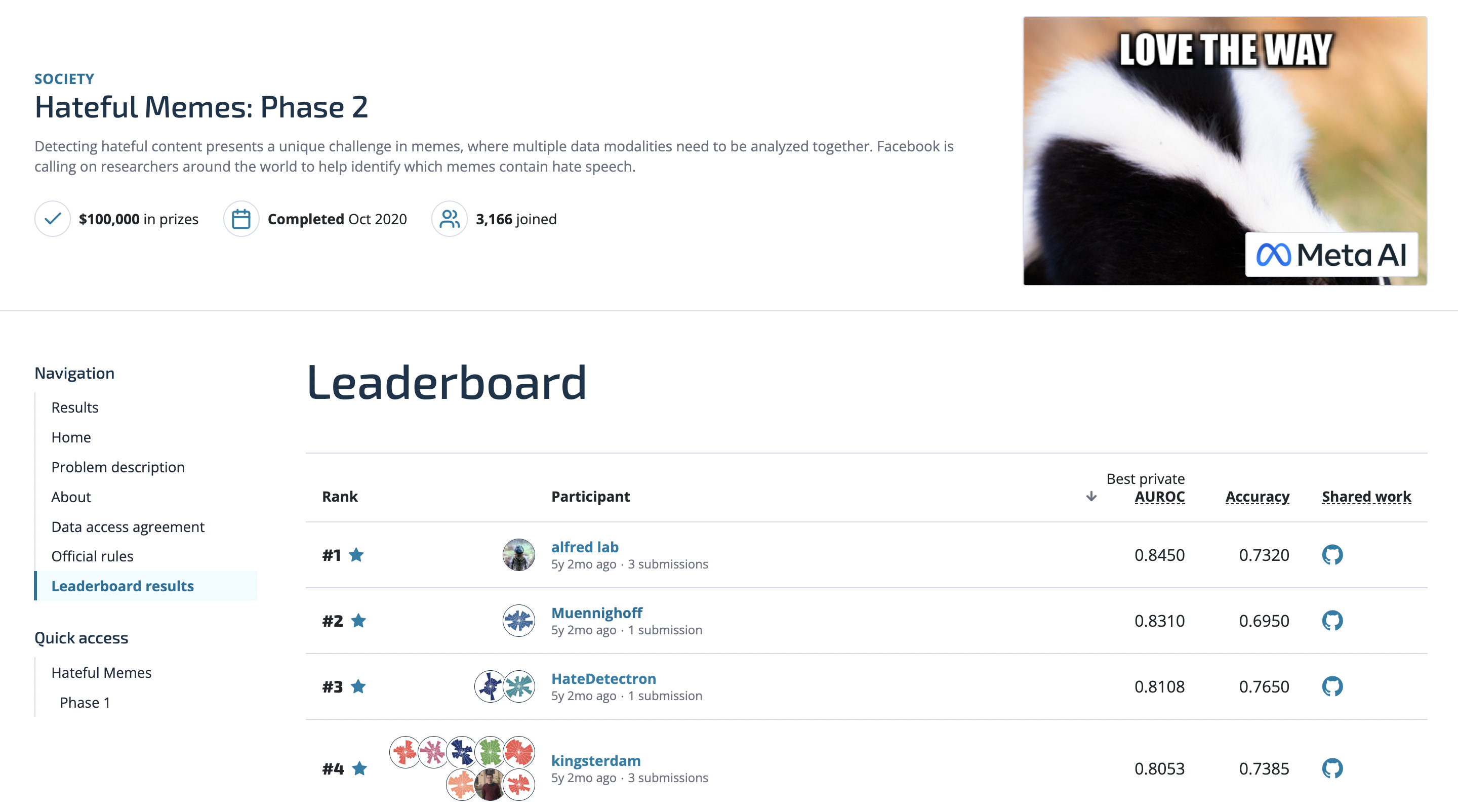 TL;DR: Built Vision-Language Models that finished 2nd/3300+ in Meta's $100K Hateful Memes Competition.
